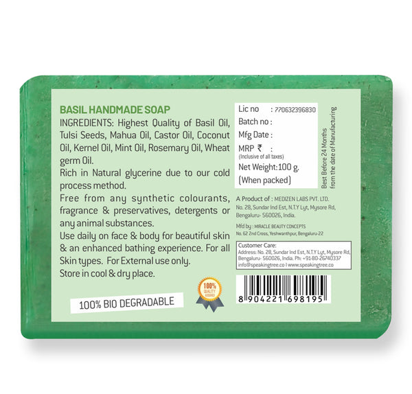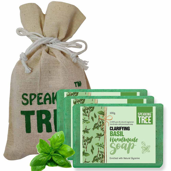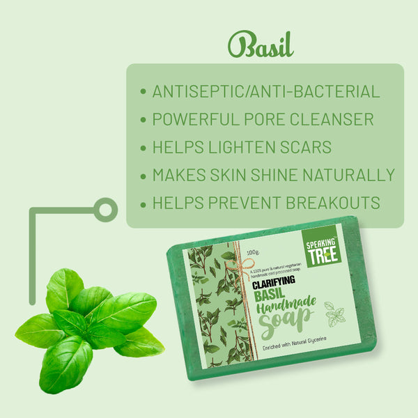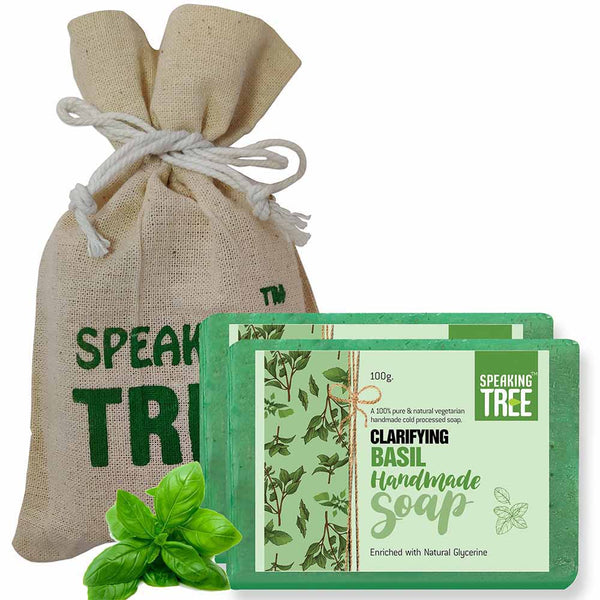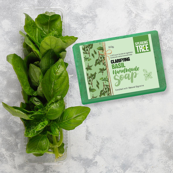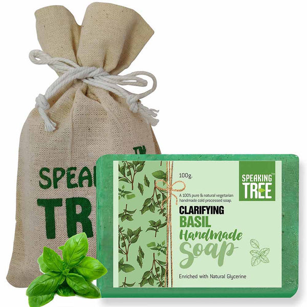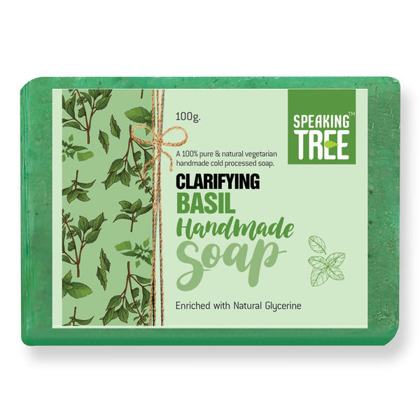 - REFRESHES & PURIFIES: Speaking Tree Clarifying Basil Soap is a gentle, natural, handmade soap made by the cold-pressed method to best preserve the quality and effectiveness of all-natural ingredients. The pure soap is free of chemicals, parabens, dyes, animal fat or artificial fragrance. The soft, non-greasy texture of the soap penetrates the deeper layers of the skin to provide deep cleansing effect, while its spicy, herbal, penetrating and lasting aroma leaves your mind and body refreshed.