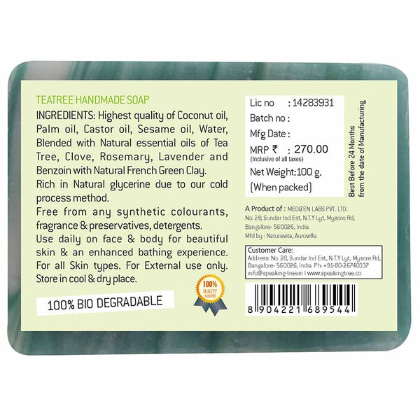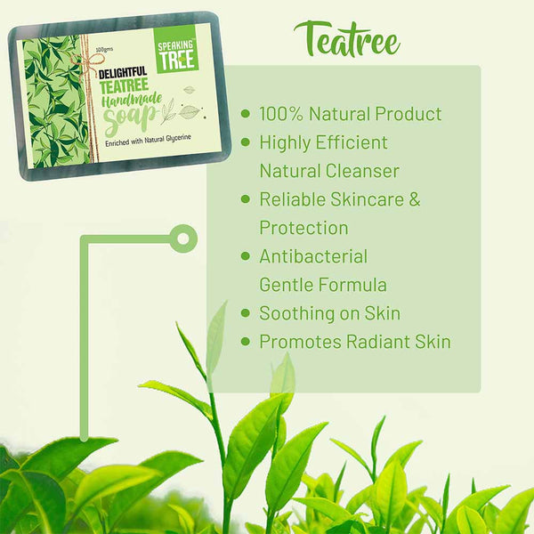 - 100% NATURAL PRODUCT: The Speaking Tree Delightful Tea tree handmade soap is pure, vegetarian, handmade, contains a blend of nature’s best ingredients specially formulated through cold pressed method to retain the quality and effectiveness of the natural ingredients. It is free of dyes, chemicals, preservatives, alcohol, foaming agents and synthetic fragrance.