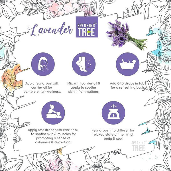 About the Product: Packed with powerful therapeutic properties, Lavender oil works magically in assisting skin for a soft, supple and refreshed look. Speaking Tree Lavender Oil is anti-inflammatory, . Experience a more stimulating or invigorating aroma by adding 4 to 6 drops in your bath tub or 2 to 5 drops to vaporizers.