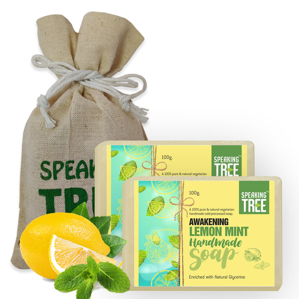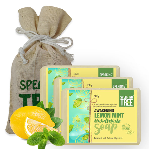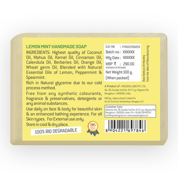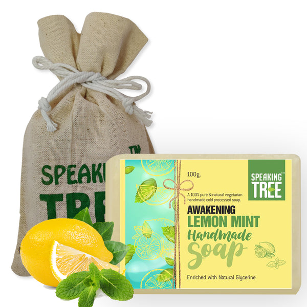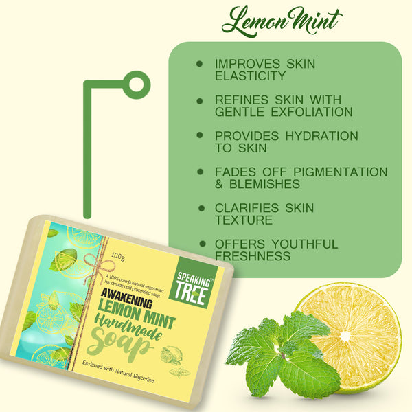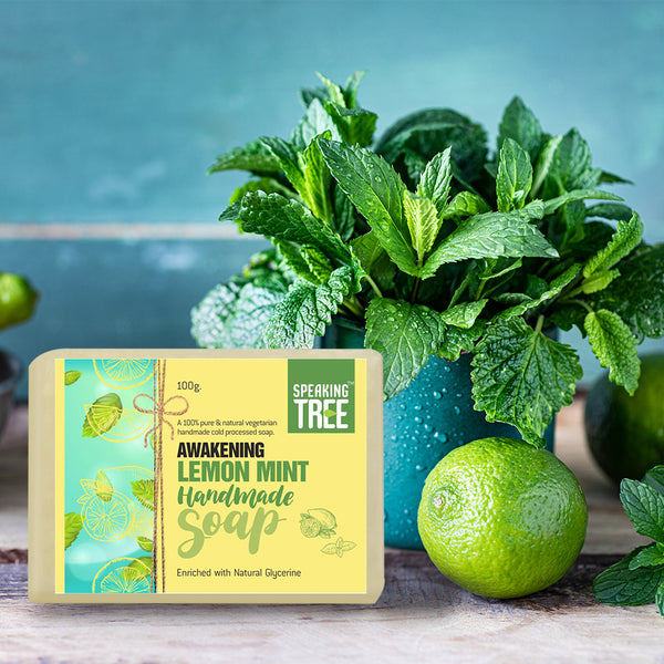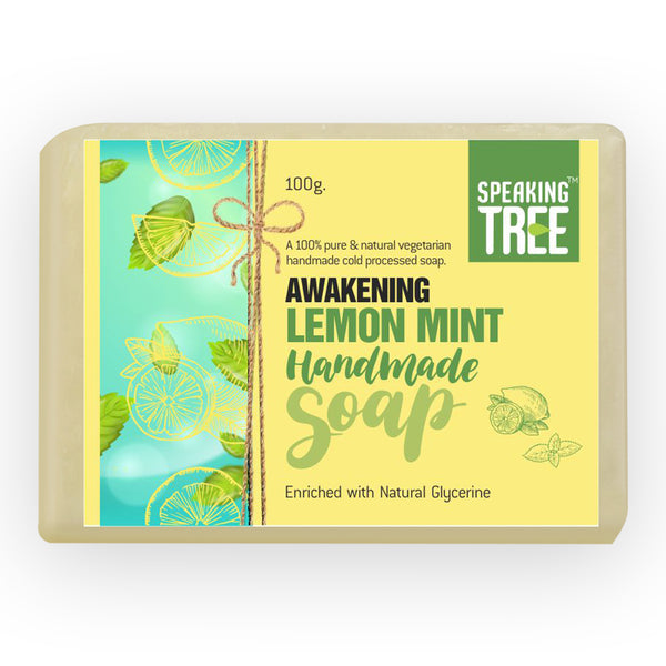- 100% NATURAL & HANDMADE: Speaking Tree lemon mint soap is pure, gentle, vegetarian, non-milk handmade soap formulated with nature’s best ingredients specially made with care by cold-processed method to retain the quality and effectiveness of natural ingredients. It is free of dyes, sulfates, chemicals, preservatives, alcohol, foaming agents, artificial fragrance, alcohol, and synthetic colour.