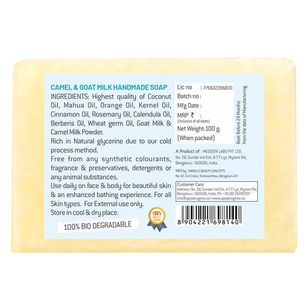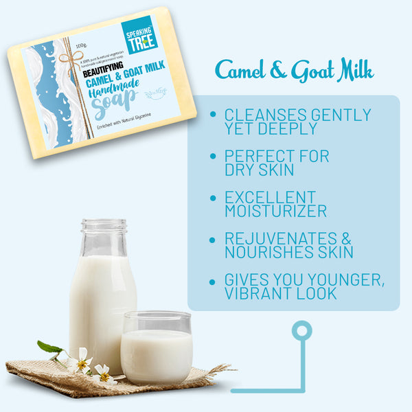 - CREAMIER & NATURAL: Camel and Goat milk soap are recognized by centuries for their beautifying properties. While the traditional soaps typically have a long list of ingredients with the first being water, Speaking Tree gentle handmade soap enriched with milk is creamier and natural alternative to traditional soaps.