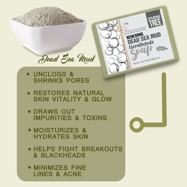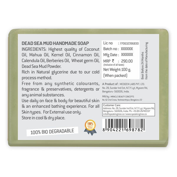 - 100% NATURAL & HANDMADE: Speaking Tree Dead Sea mud soap is pure, gentle, vegetarian, non-milk handmade soap formulated with nature’s best ingredients specially made with care by cold-processed method to retain the quality and effectiveness of natural ingredients. It is free of dyes, sulfates, chemicals, preservatives, alcohol, foaming agents, artificial fragrance, alcohol, and synthetic colour.
