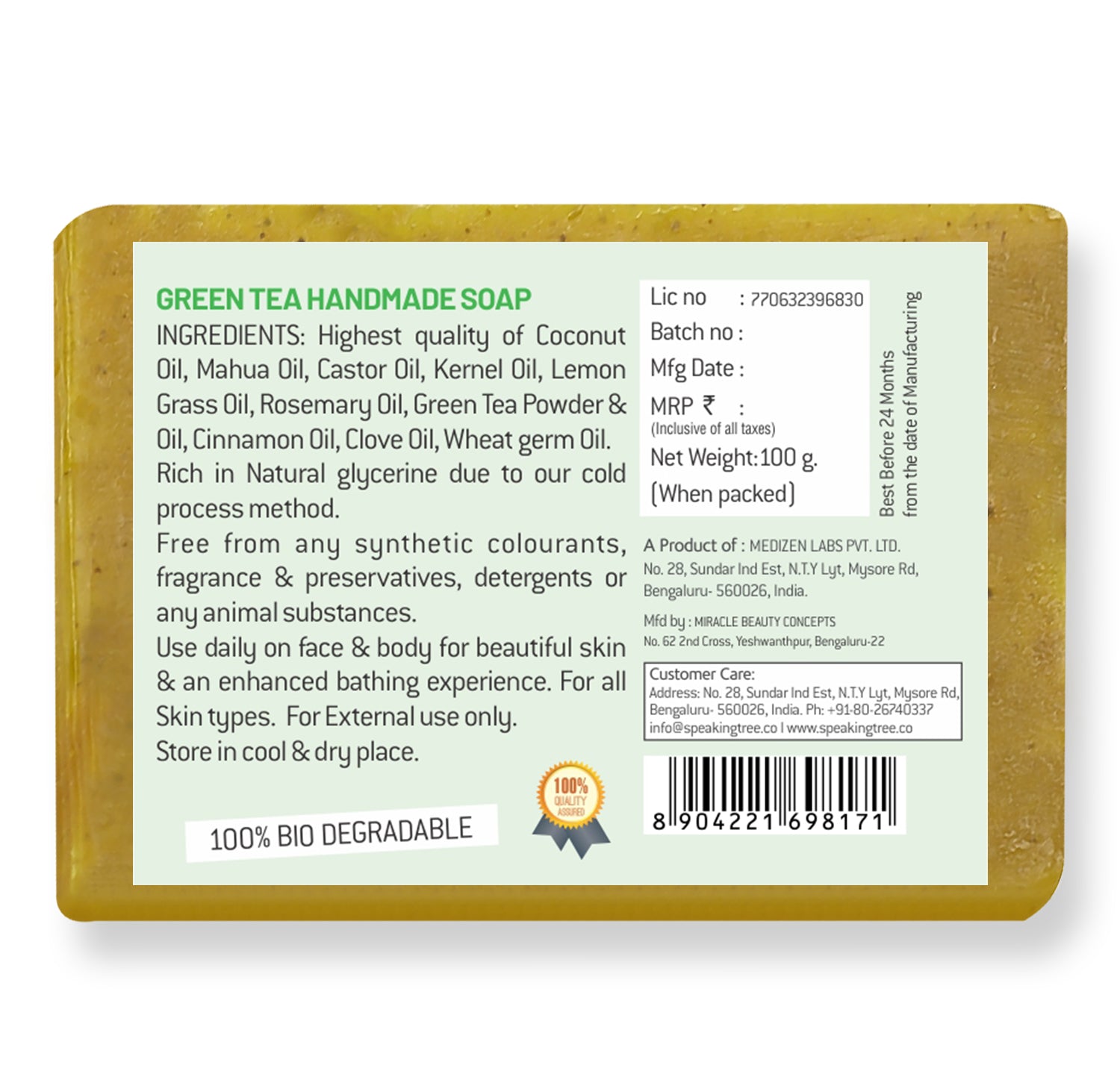 - NATURAL HANDMADE SOAP: Speaking Tree green tea soap is a 100% vegetarian, natural handmade which is made by the cold-pressed method and does not include any kind of preservatives or harmful additives. Packed with extracts of pure, green tea leaves, the soap is exceptionally mild, non-toxic, natural way of getting the anti-bacterial and skin-beautifying effects of green tea as part of your daily showering procedural.
