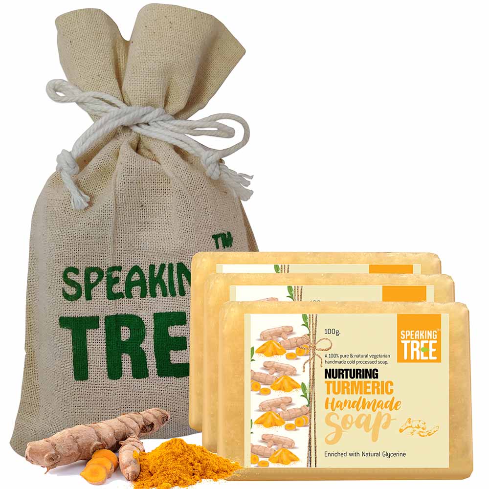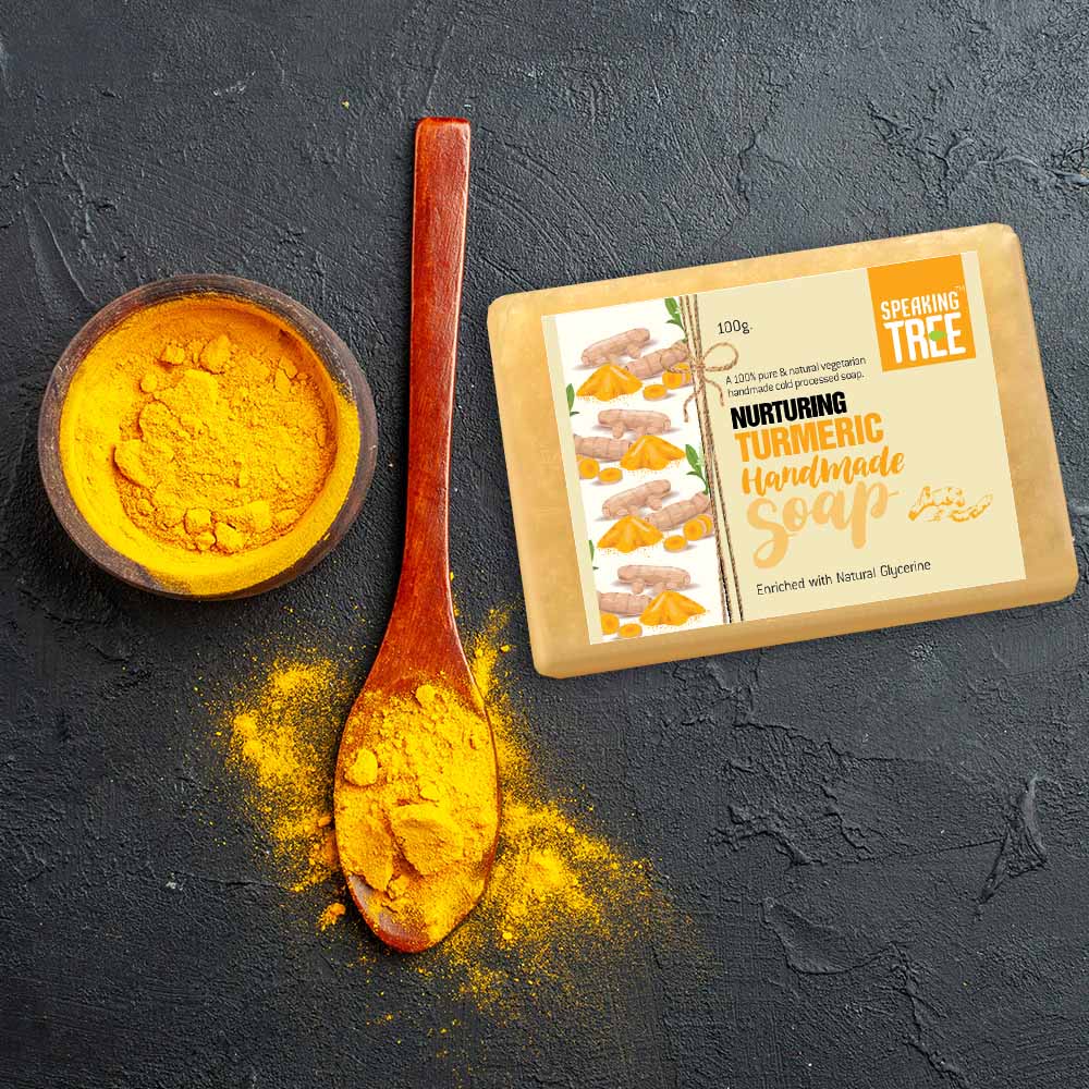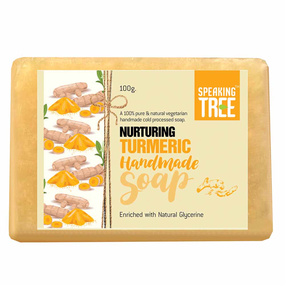 - ADDS GLOW & LUSTER TO THE SKIN: Speaking Tree Turmeric handmade soap not just brightens skin but also reduces pigmentation, increases glow and lustre of the skin. Turmeric has an anti-inflammatory, anti-microbial, and antioxidant effect which can lighten the pigmentation, brighten the complexion, evens out skin discolouration, reduces acne scarring, and brings out your natural glow.