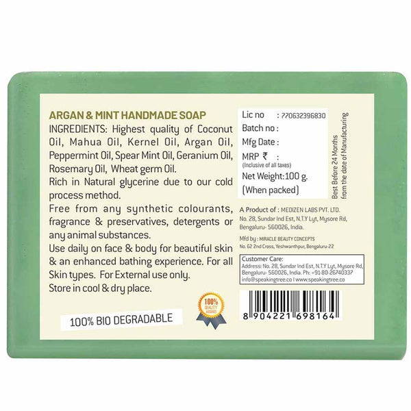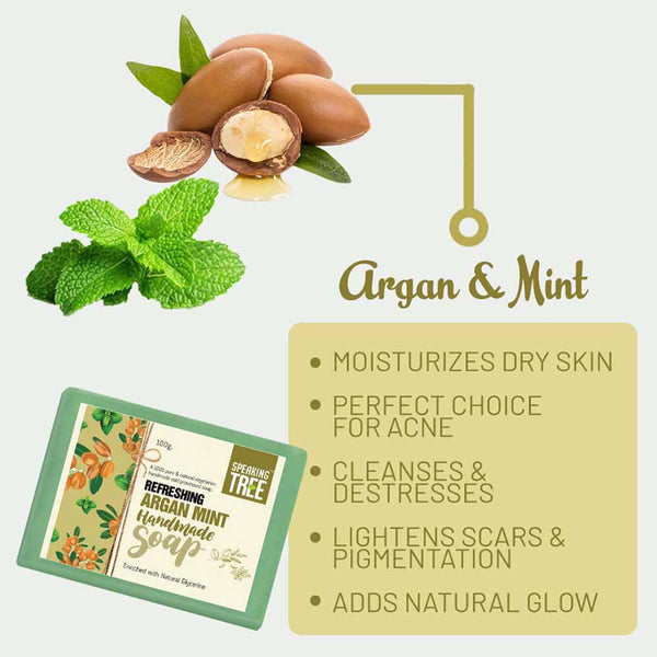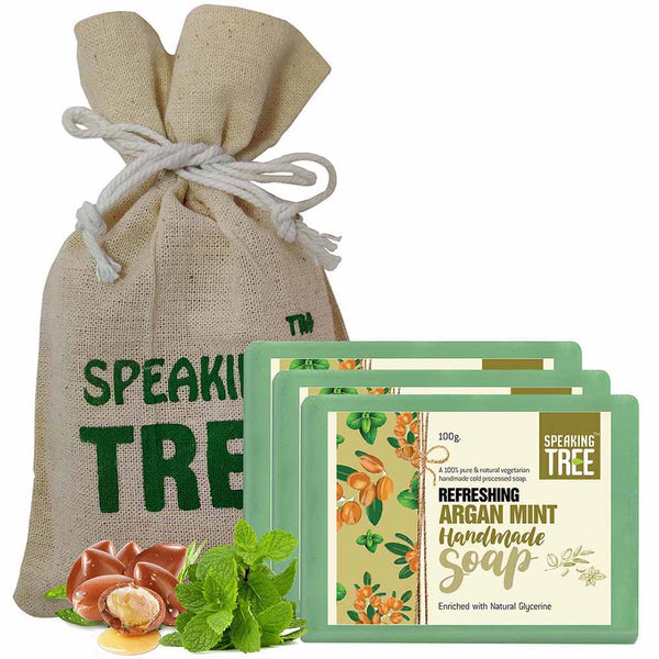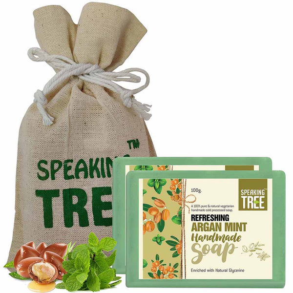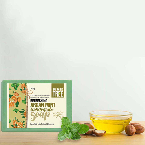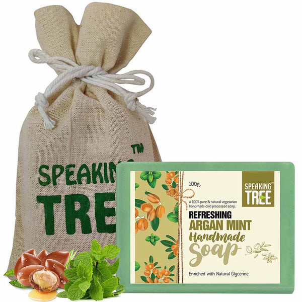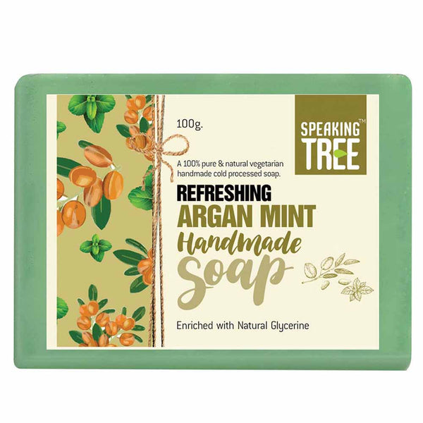 - PROMOTES HEALTHY SKIN: Speaking Tree Argan & Mint handmade soap is infused with the revitalizing and refreshing goodness of argan and mint. Known for its cooling properties, mint also has antiseptic properties, helps unclog the pores, giving you soft and radiant skin. The non-greasy moisturizing quality of argan soap helps to repair damaged skin and promotes healthy glowing skin.