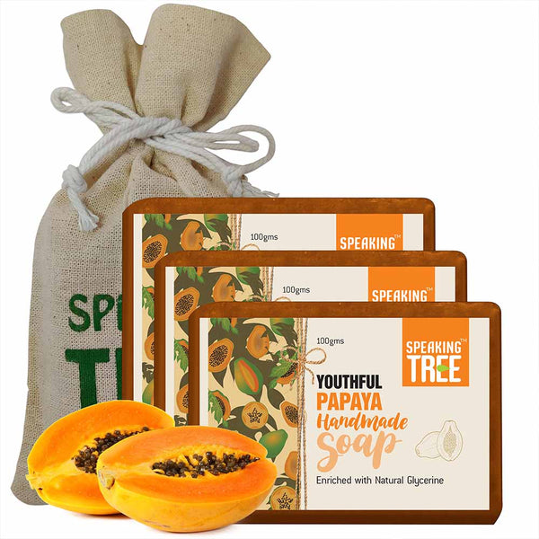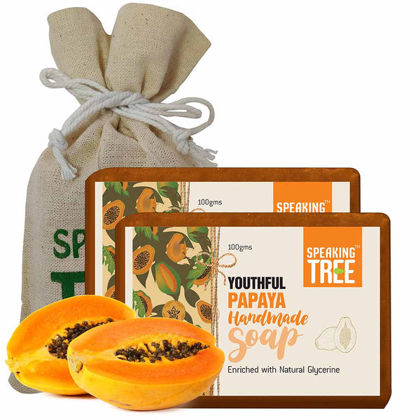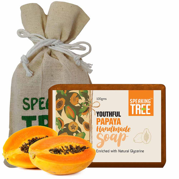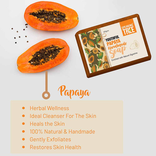 - PROMOTES HEALTHIER SKIN: Speaking Tree Youthful Papaya Handmade soap promotes production of new skin cells, reduce pigmentation and stimulate collagen production. It effectively deals with acne scars, freckles, age spots, and other skin tone imperfections. Helps prevents dead skin cells from clogging pores, promotes removal of dead skin cells, and reduces appearance of dark patches.