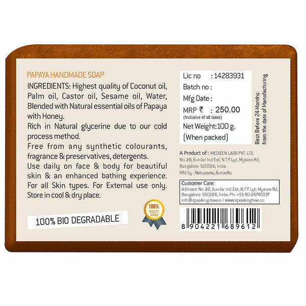 - 100% NATURAL & HANDMADE: Unlike the commercial soaps which wash away dirt and skin’s natural moisture, our hand-made soap is made with fresh papaya fruit extract with a blend of emollient oils using traditional cold pressed method. The vegetarian soap is free of parabens, hardening agents, chemicals, colours, foaming agents