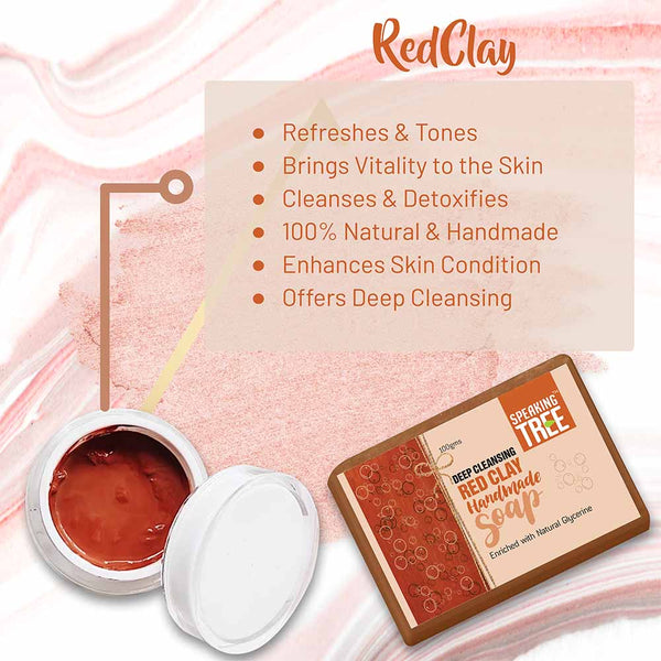 - REFRESHES & TONES: Speaking Tree Deep Cleansing Red Clay handmade soap is made with red clay, which is globally renowned for its cleansing and anti-aging benefits. The soap is a great addition to your skincare routine as it is a convenient way to access the beauty benefits of red clay. It moisturizes, refreshes, tones and tightens the contour of the skin, smoothens wrinkles, rebalances dry, flaky skin, nourish the skin, even out stubborn blackheads.