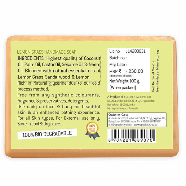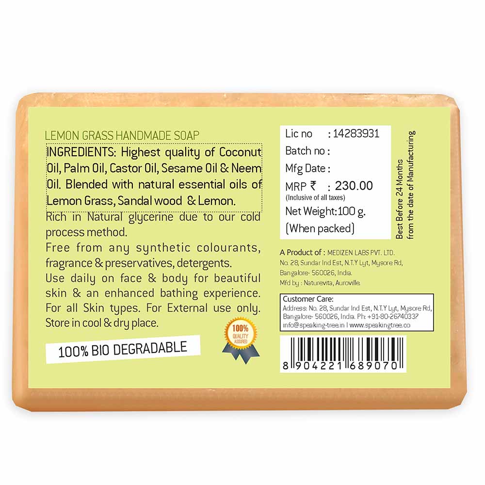 - PURITY & LOVE: Unlike other chemical based soap bars and liquids, This soap is 100 percent Pure, Natural, Vegetarian, Handmade and Cold processed, which is free from synthetic colorants, fragrance, preservatives, detergents and animal substances. Speaking Tree Refreshing Lemongrass Soap is enriched with natural glycerine.