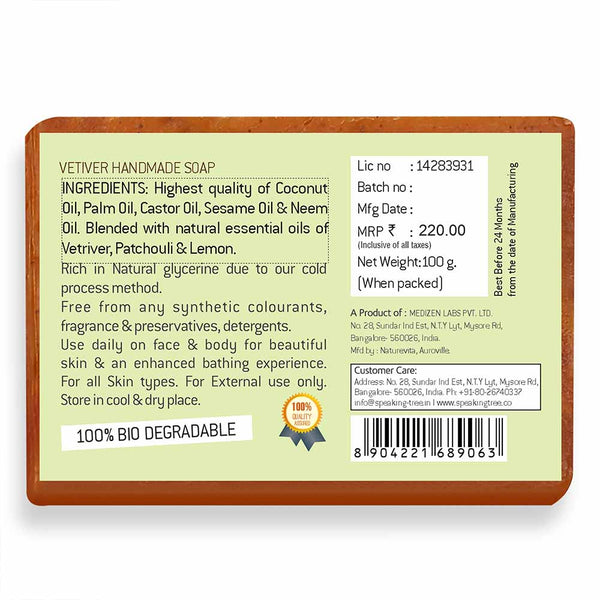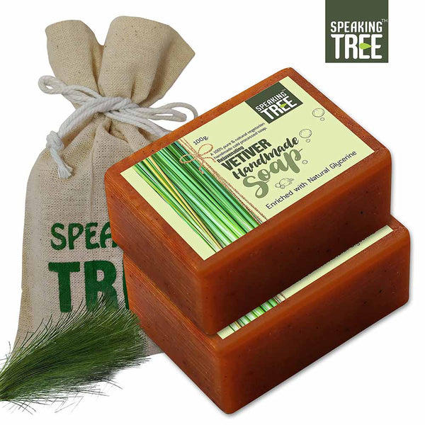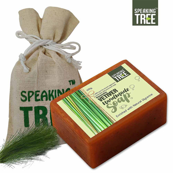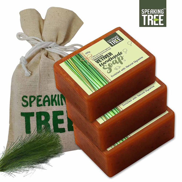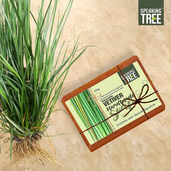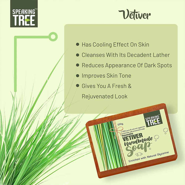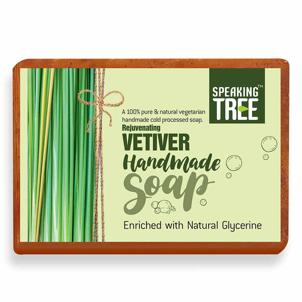 - SOFTER, YOUNGER AND GORGEOUS YOU: Vetiver is known to strengthen connective tissues, cure pain in muscles and promote a cleansed and happy skin. Accumulated dead cells are removed as it boosts the cell-growth and regeneration. Pigmentation, blemishes and marks fade away in no time and a softer, younger and gorgeous you greets you in the mirror within the first few days of use. 100% NATURAL AND HANDMADE: The very best reason to use Speaking Tree soap is the ingredients.