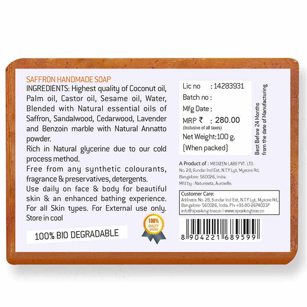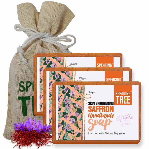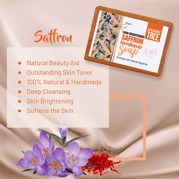 - DEEP CLEANSING: Speaking Tree Skin Brightening Saffron Handmade soap is a natural way to counter the effects of pollutants without being harsh on your skin. The super hydrating soap has a mild, divine aroma which imparts exponential sensorial experience. Regular usage gives your skin all the rejuvenation it needs, purifies the skin and restores its lost radiance.