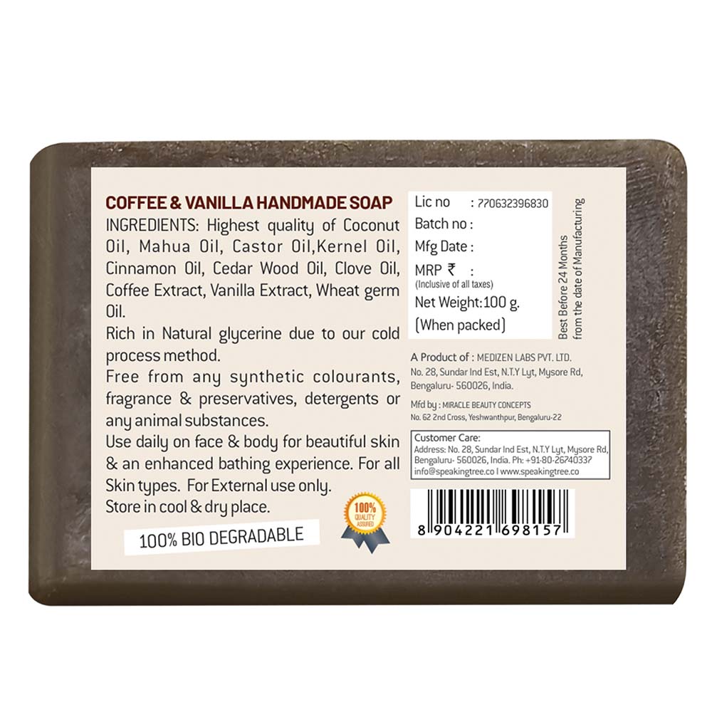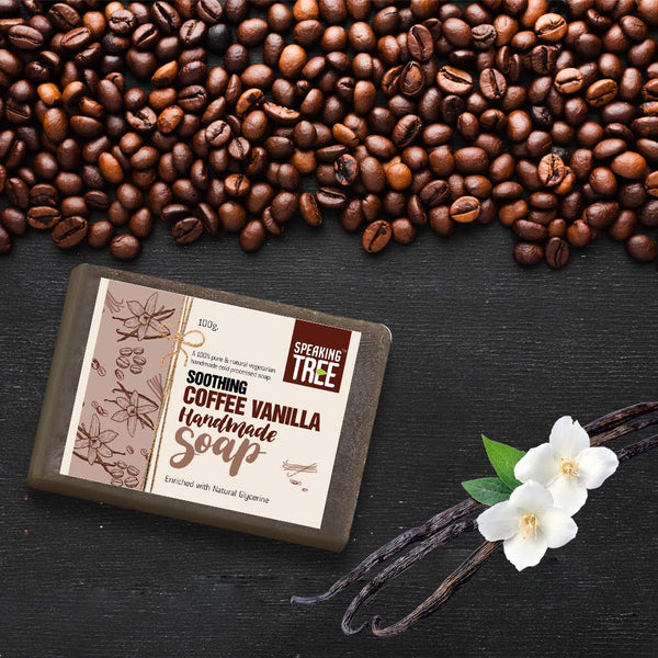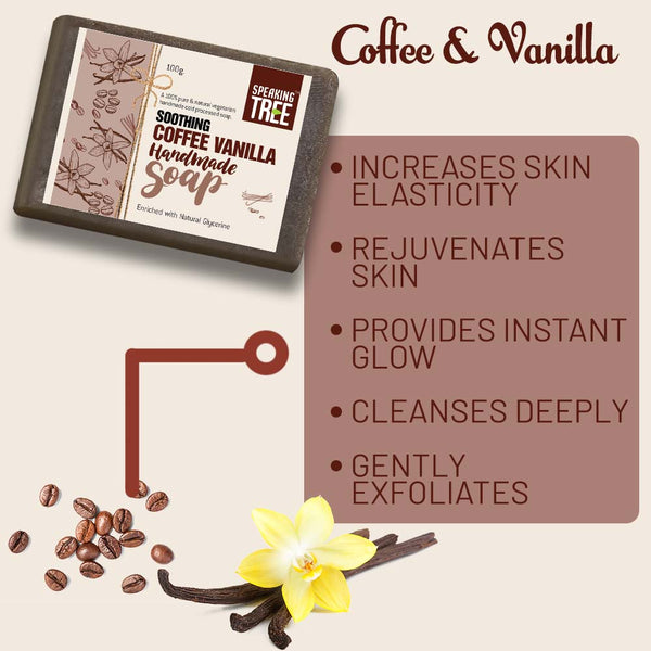 - PURE HANDMADE SOAP: The mild, gentle, 100% vegetarian handmade soap includes a perfect combination of coffee and vanilla which makes your skin feel like getting pampered. Coffee is a good skin polisher and vanilla is an excellent skincare ingredient which nourishes, revitalizes and rejuvenates skin with the pure aroma of which help your mind clear of all blues.